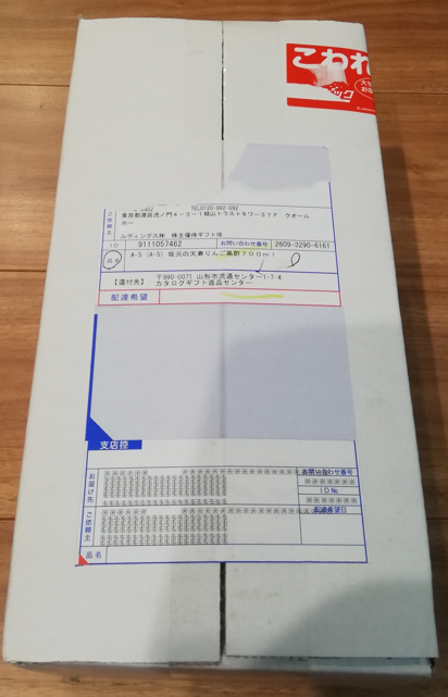 それでは、『りんご黒酢』のご紹介です。『↓』は宅急便から荷物が届いた様子です。外装の段ボールのおかげで化粧箱がしっかりと守られています☆彡