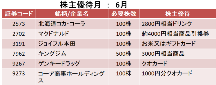 6月以外の優待銘柄は『↓↓』にまとめています。