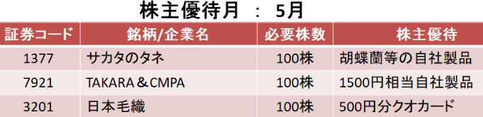 上記条件を満たす銘柄は自ずと決まってきますので、以下に5月のおすすめ優待をご紹介します。