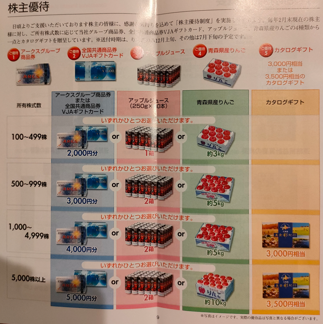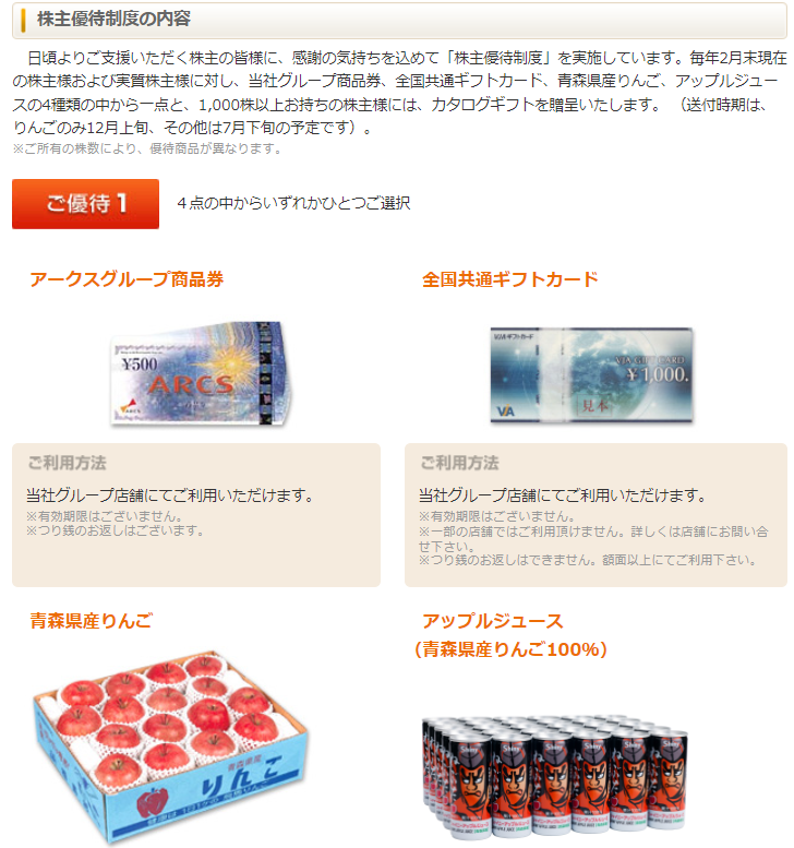 『アークス』の株主優待は、2月に100株保有していればリンゴ関係優待カタログ『青森県産果汁100%りんごジュース』が貰えます。