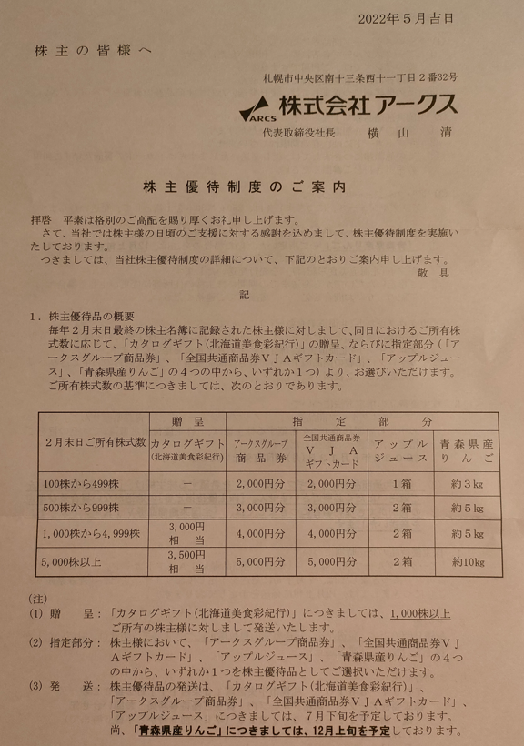 2022年7月某日、『アークス(証券コード:9948)』 から株主優待が届きました。
