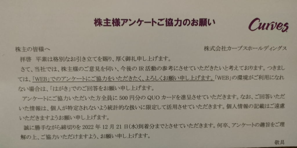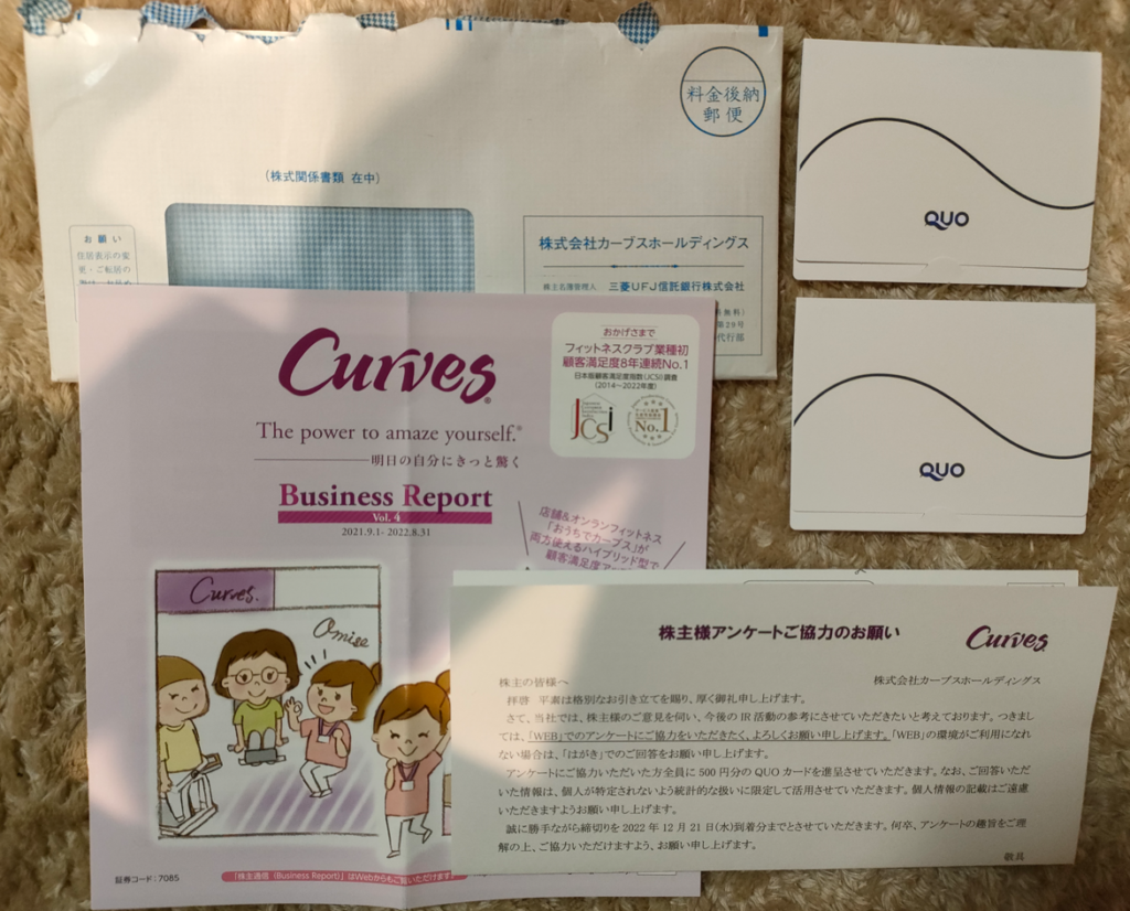 2022年12月某日、『カーブス(証券コード:7085)』 から株主優待が届きました。