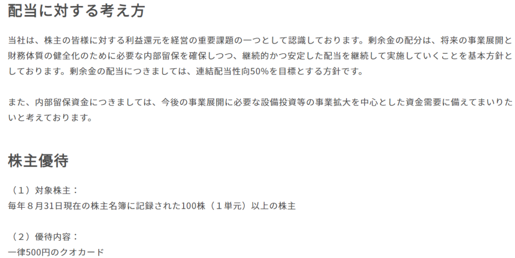 『カーブス』の株主優待は、8月に100株保有していれば、『500円クオカード』が貰えます。優待品を得るための長期株保有条件もないのでおすすめです。
