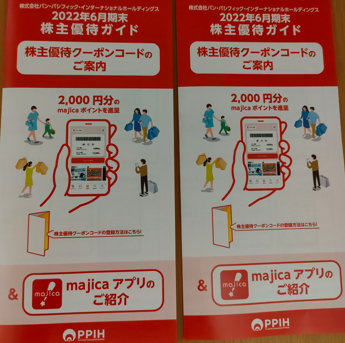 株主優待で年間数十万円も得している私が、『パンパシフィックインターナショナル(PPIH)』の株主優待、『2000円分のmajicaクーポン券』を実物の写真を交えてご紹介します。