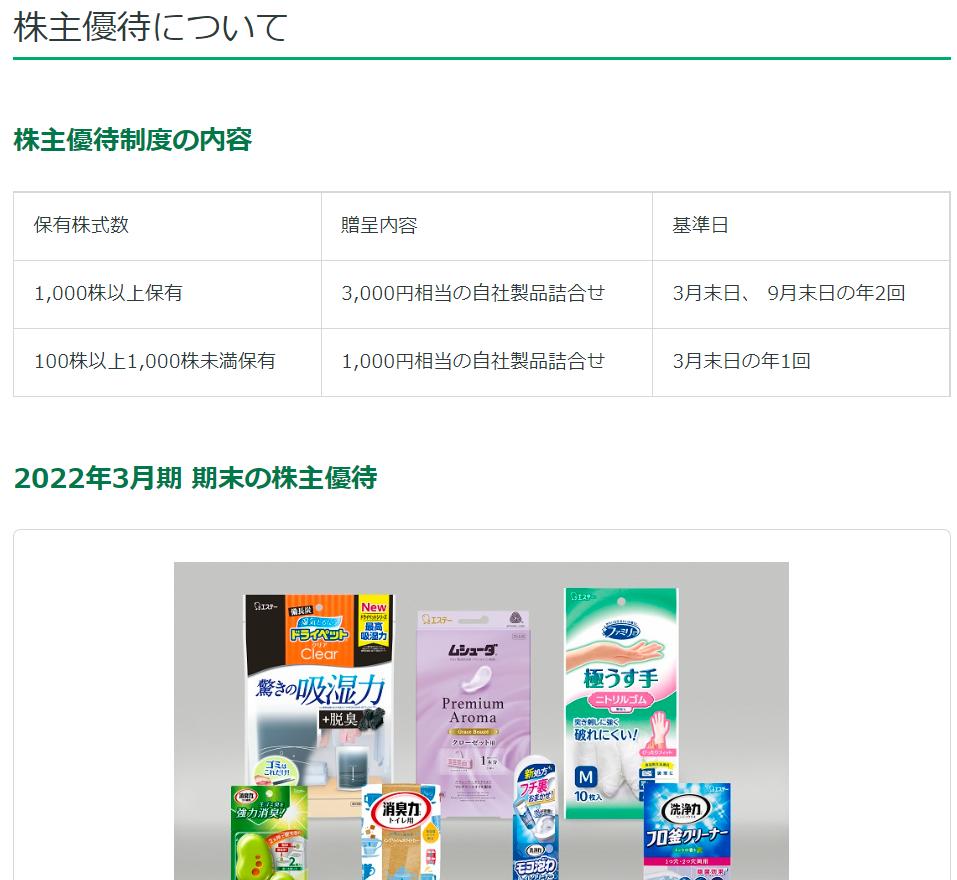 エステーの株主優待は『1000円相当自社製品詰め合わせ』