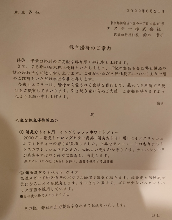 2022年7月某日、『エステー(証券コード:4951)』 から株主優待が届きました。