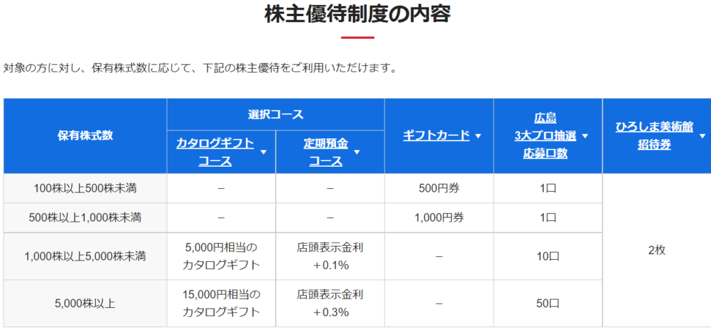 『ひろぎんホールディングス』の株主優待は、3月に100株保有していれば、『500円クオカード』が貰えます。優待品を得るための長期株保有条件もないのでおすすめです。