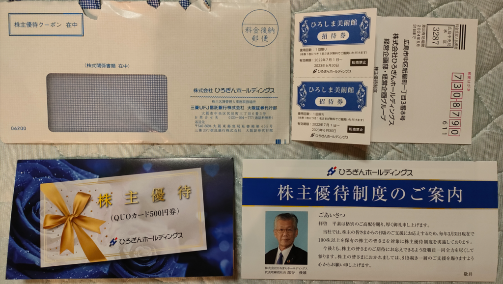 2022年7月某日、『ひろぎんホールディングス(証券コード:7337)』 から株主優待が届きました。