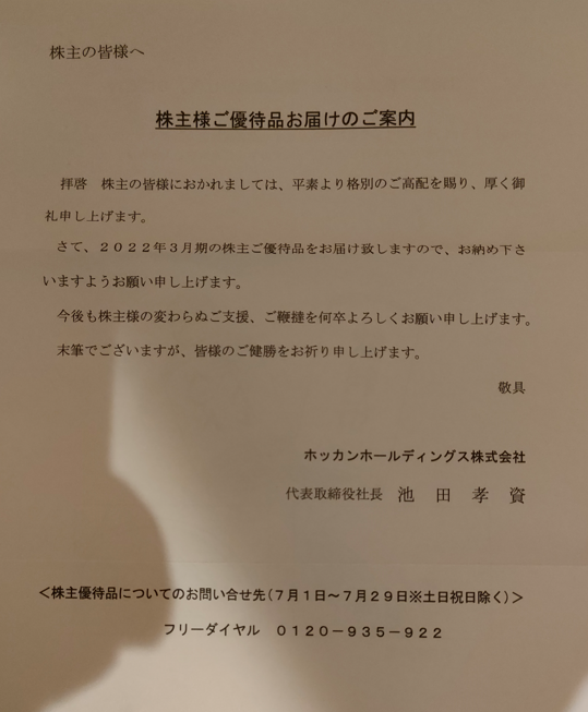 2022年7月某日、『ホッカン(証券コード:5902)』 から株主優待が届きました。