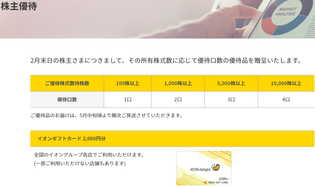 1000株だと4000円分のイオンギフトカードがもらえます。