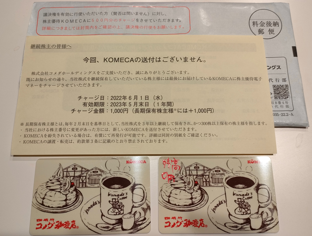 2022年5月某日、『コメダホールディングス(証券コード:3543)』 から株主優待が届きました。