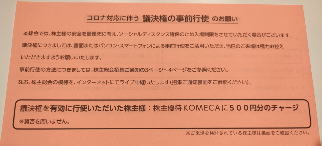 100株保有で1000円分のコメカを貰えますが、なんと、決議権行使でさらに500円貰えます。早速、行使しました。