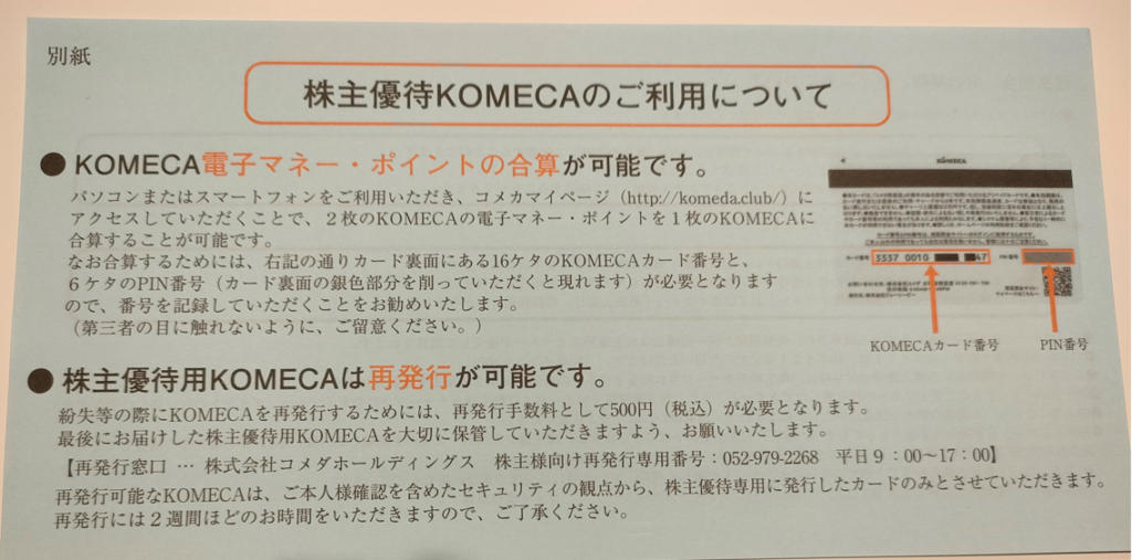 夫婦でコメダホールディングスの株保有している方など、複数枚のコメカをお持ちの方は、コメカ残高を1枚にまとめることができます。