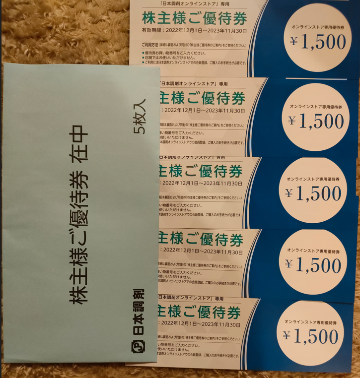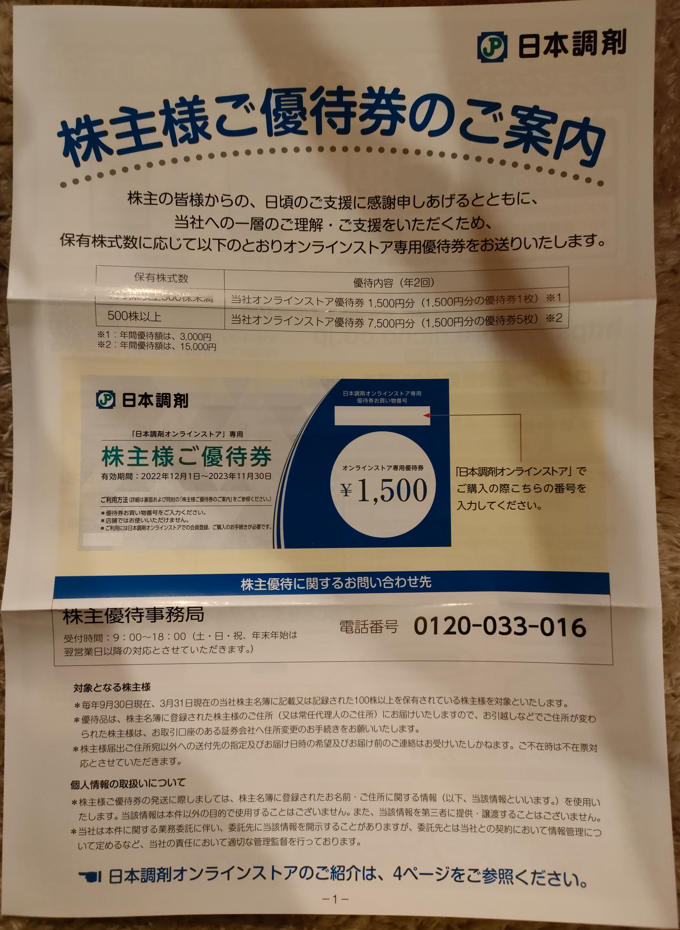日本調剤/株主優待/2022年 7500円クーポン券と商品が到着。クロス取引するなら500株がマスト。