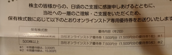 100株保有で1500円相当のクーポン券。500株で7500円のクーポン券がもらえます。