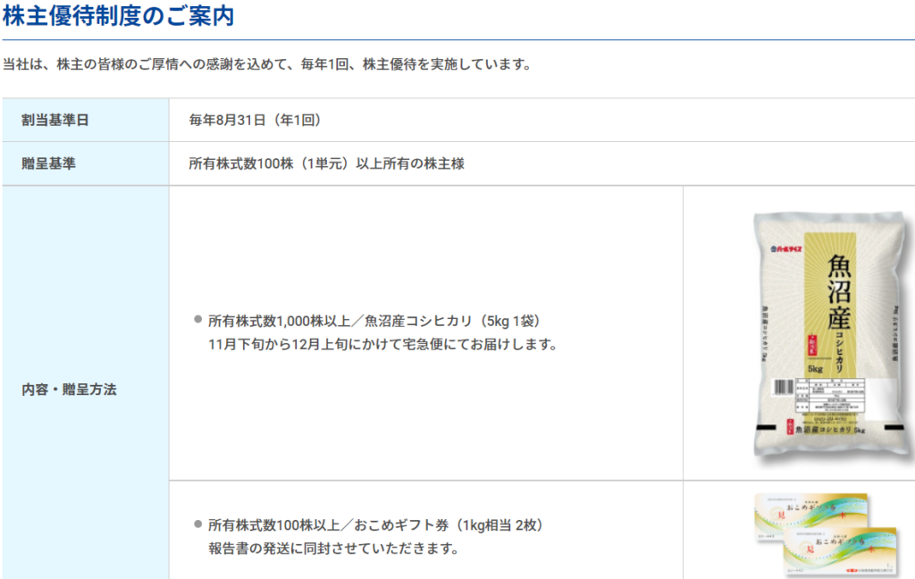 『進和』の株主優待は、8月に100株保有していれば『お米券2kg分』が貰えます。優待品を得るための長期株保有条件もないのでおすすめです。