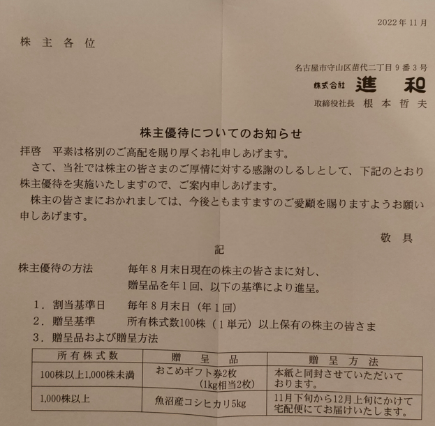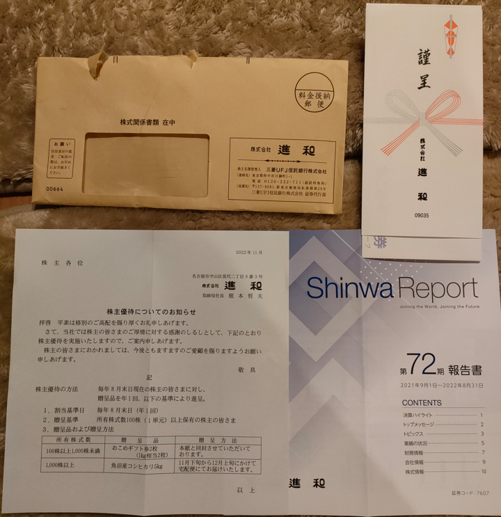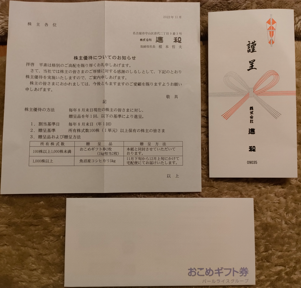 2022年11月某日、『進和(証券コード:7607)』 から株主優待が届きました。
