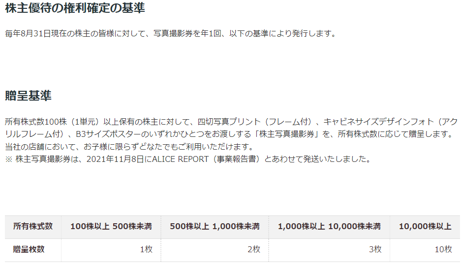 スタジオアリスの株主優待は8月に100株保有していれば『数千円相当の株主写真撮影券』が貰えます。