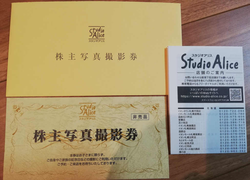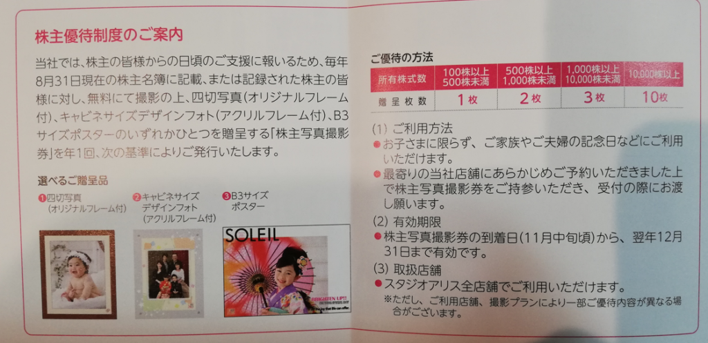 株主優待で年間数万円も得している私が、『スタジオアリス』の株主優待、数千円相当の株主写真撮影券を実物の写真を交えてご紹介します。