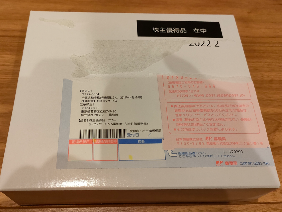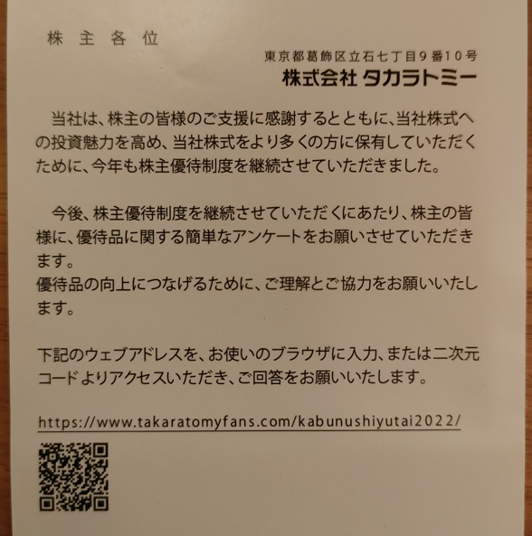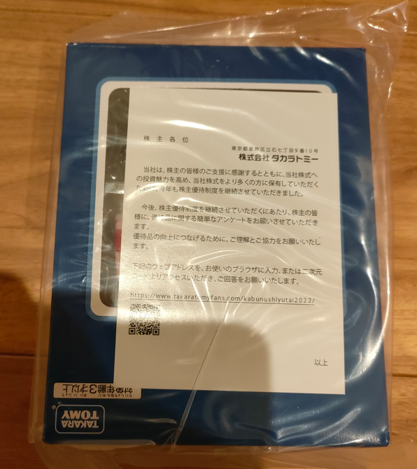 2022年10月某日、『タカラトミー(証券コード:7867)』 から株主優待が届きました。