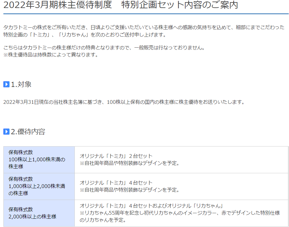 『↓』は株主優待案内ページです。ぜひ参考にされてください。100株保有でトミカ2台セット、1000株保有でトミカ4台セットの優待品がもらえます。