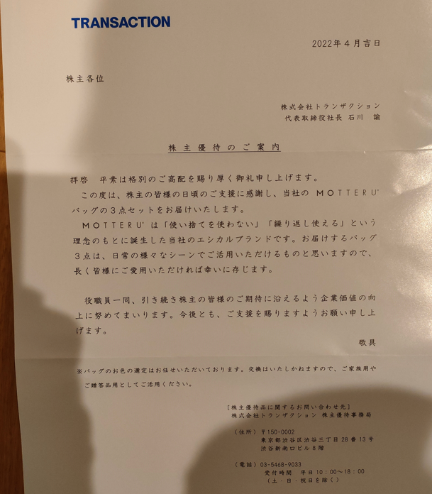 2022年4月某日、『トランザクション(証券コード:7818)』 から株主優待が届きました。