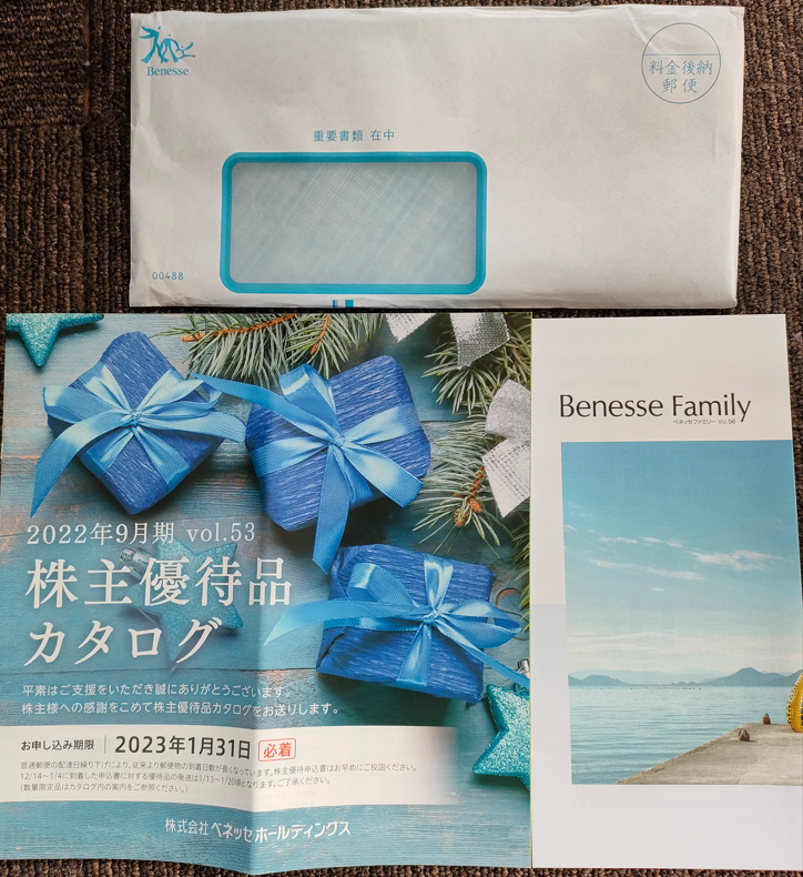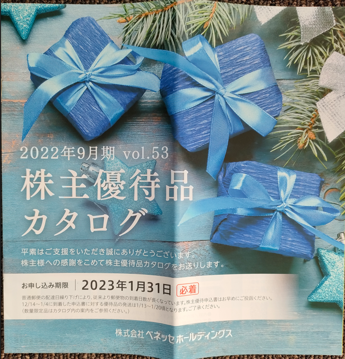 2022年12月某日、『㈱ベネッセホールディングス(証券コード:9783)』 から株主優待が届きました☆彡なんと、 自社グループ会社の優待カタログ!!