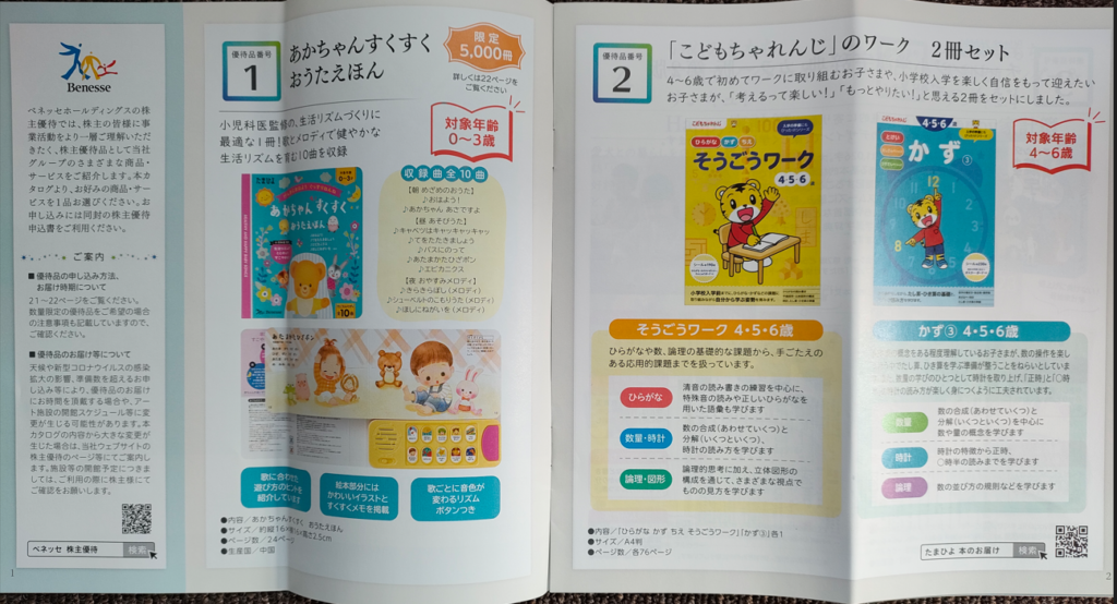 それでは株主優待カタログの全ページ紹介です。このカタログから、私は「お歌絵本」と「ベネッセハウスバスタオル」を選択しましたので、下の方にその写真も載せています。