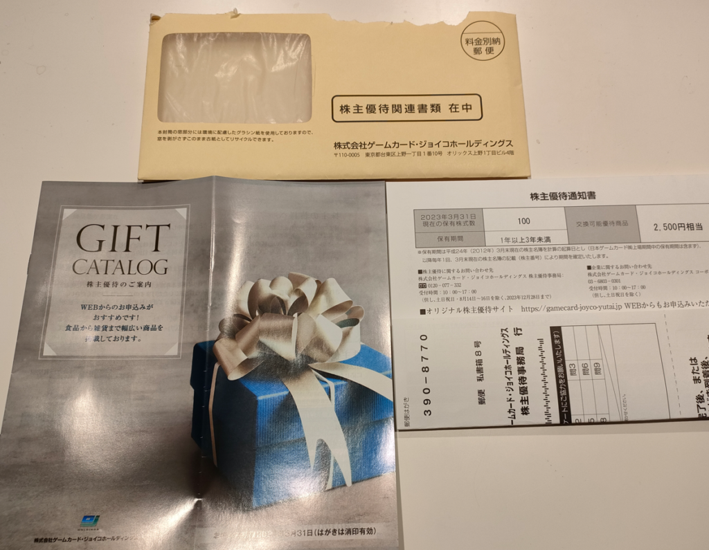 2023年7月某日、『ゲームカードジョイコホールディングス』 から株主優待が届きました。