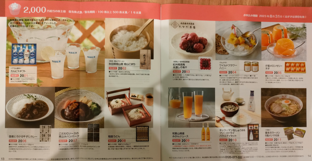 ↓はカタログが郵送されてきた時の写真です。100株1年保有で2500円相当が貰えます。