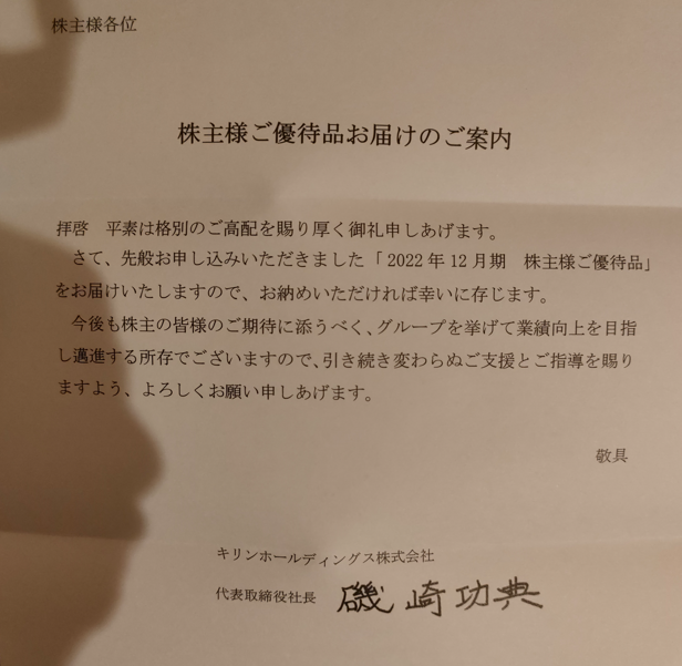 2023年6月某日、『キリン』 から株主優待が届きました。