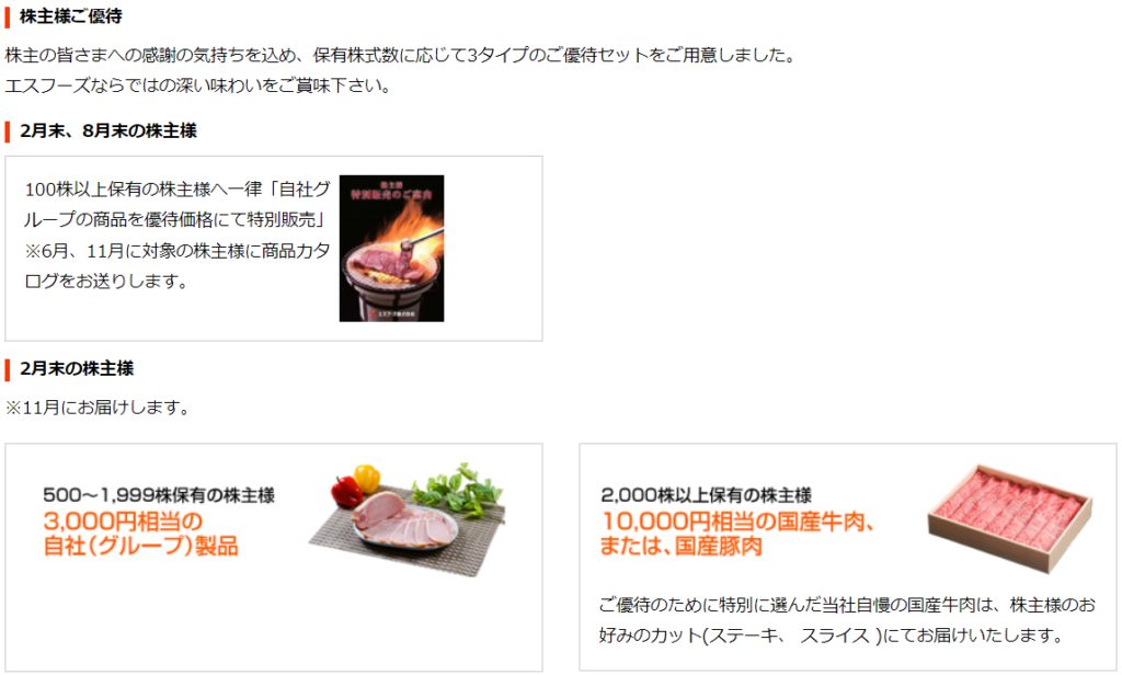 『エスフーズ』の株主優待は、2月と8月に100株保有していれば『株主専用特別販売カタログ』が貰えます。