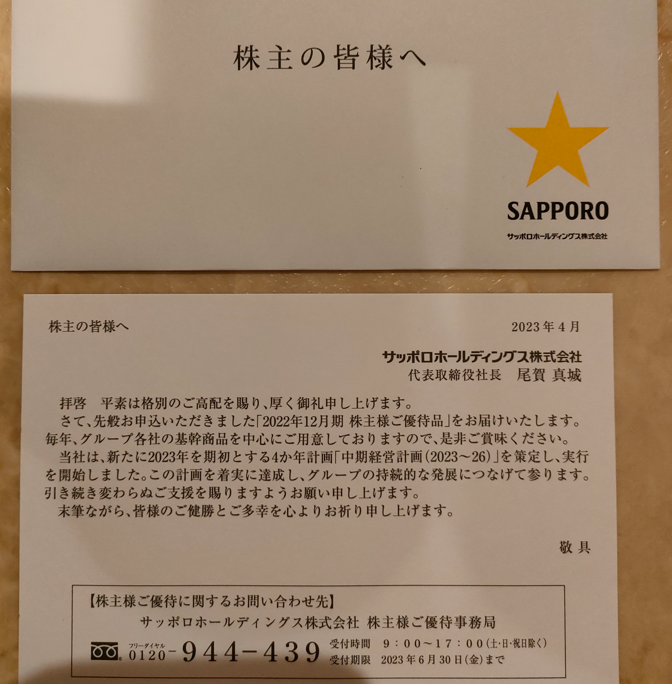 2023年6月某日、『SAPPORO』 から株主優待が届きました。