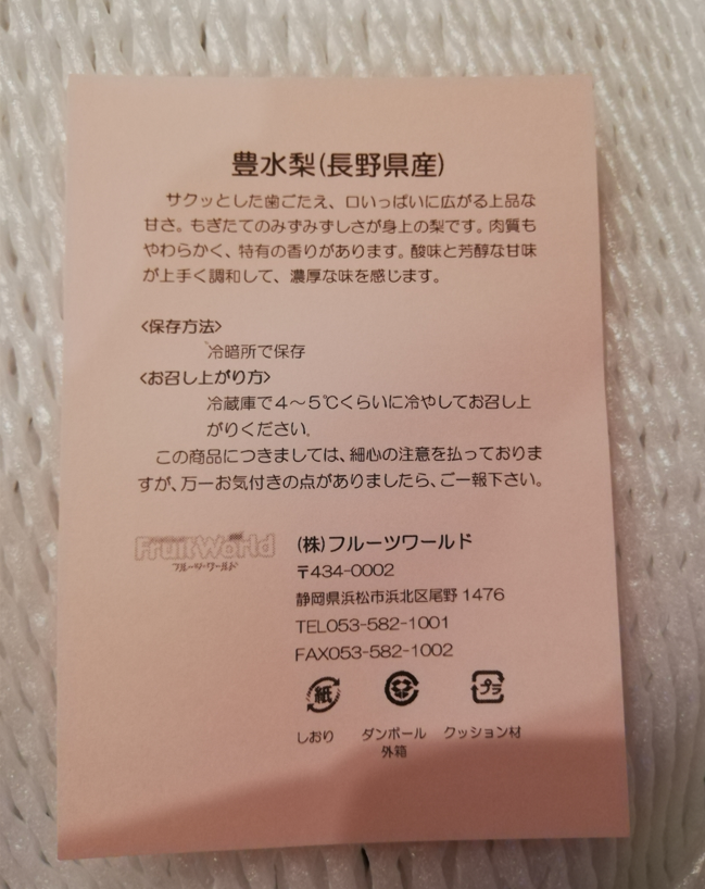 早速、段ボールを開封。すると1枚の紙が入っていました。梨の品種説明書です^^豊水梨は、歯ごたえや、みずみずしさ、酸味と甘みの絶妙なバランスが特長の梨のようです☆彡