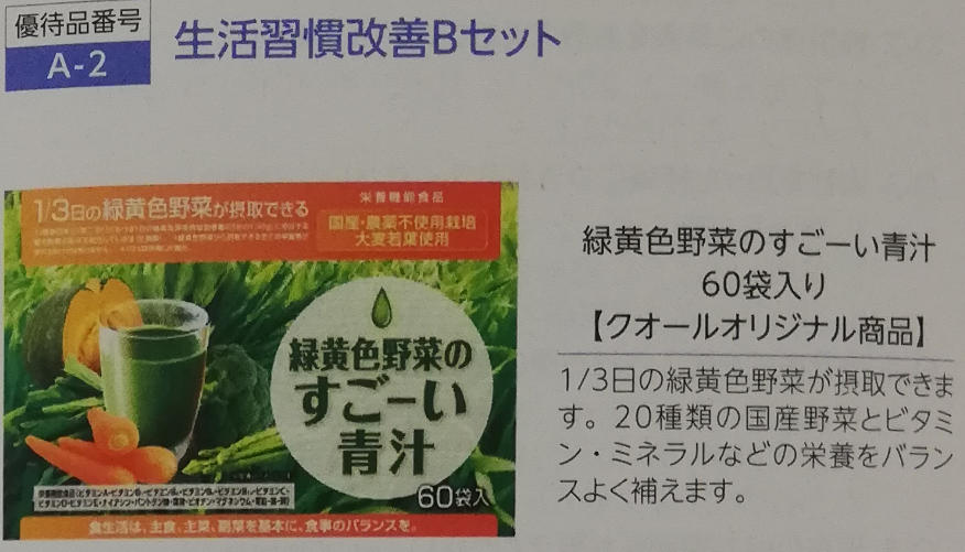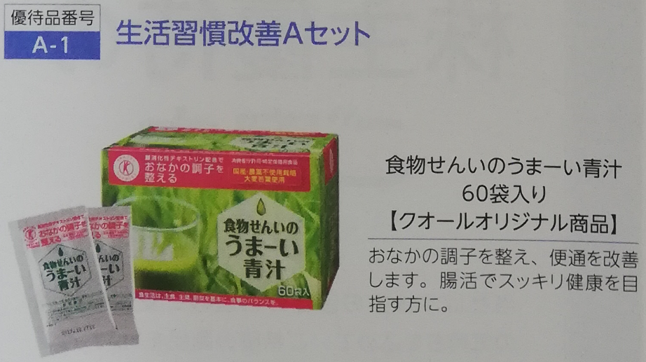 1つ目のカタログ商品は、『食物繊維のうまーい青汁(60袋入り)』です。おなかの調子を整え、便通を改善する効果があります^^