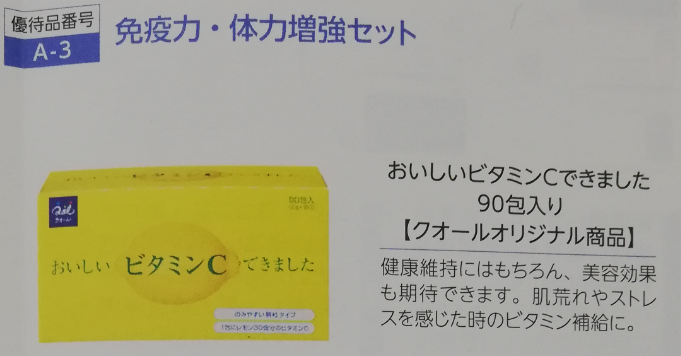 3つ目は、『おいしいビタミンCできました(90袋入り)』です。健康維持に加え美容効果も期待できる商品です。肌荒れやストレスを感じた時のビタミン補給に最適です。