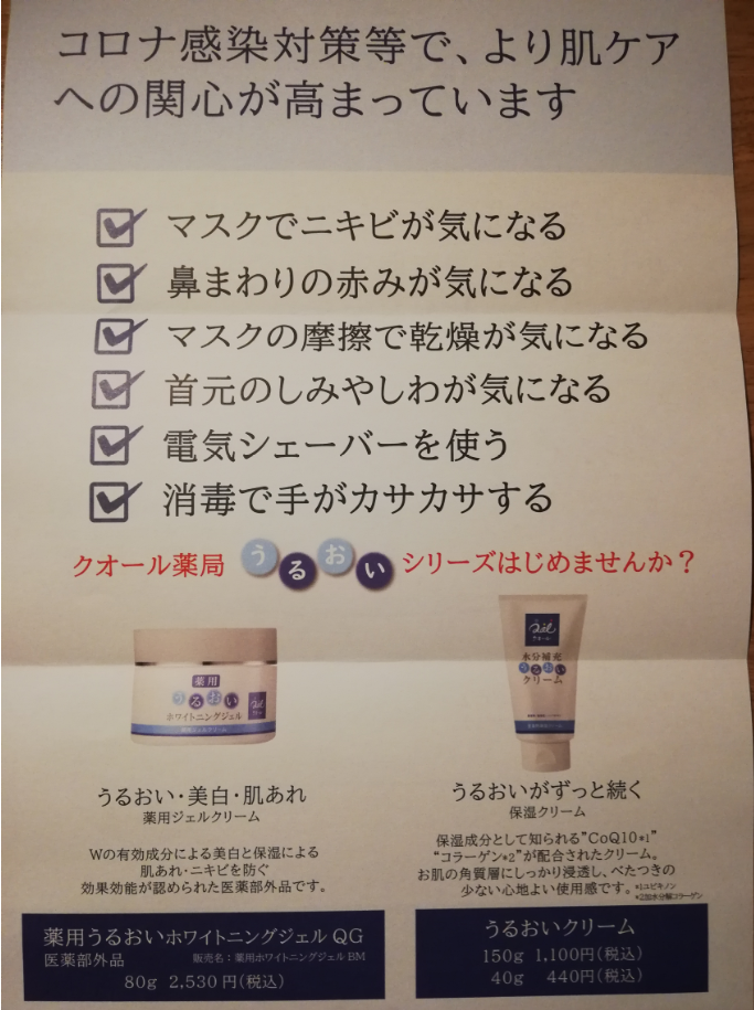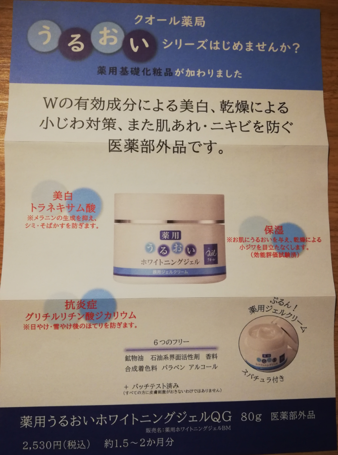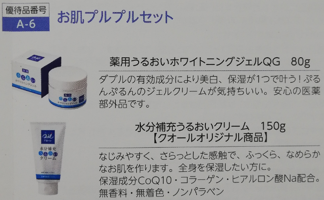 6つ目は、『薬用うるおいホワイトニングジェルQG』と『水分補充うるおいクリーム』です。『薬用うるおいホワイトニングジェルQG』は、ダブルの有効成分により美白、保湿がこの1つで叶います!ジェルタイプのクリームです^^。『水分補充うるおいクリーム』は、なじみやすく、さらっとした感触で鵜、ふっくらなめらかなお肌を作ります。