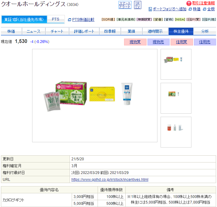 クオールホールディングスの株主優待は3月に100株保有していれば、株主優待をゲットできます。ちなみに、クロス取引の手数料は100円台です^^100円台で3000円分のカタログギフトを頂けますので超お得ですね^^
