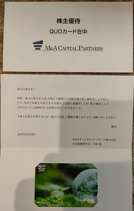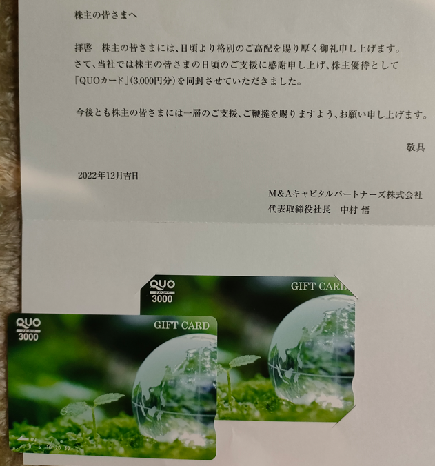 M&Aキャピタルパートナーズの株主優待は『3000円クオカード』