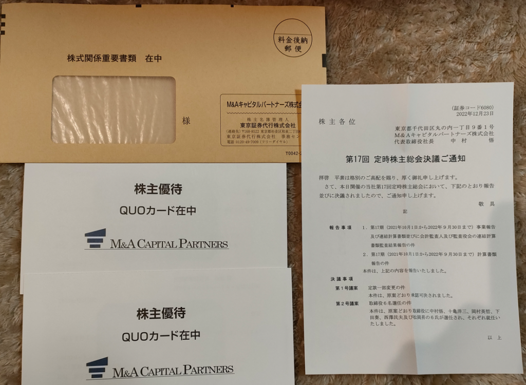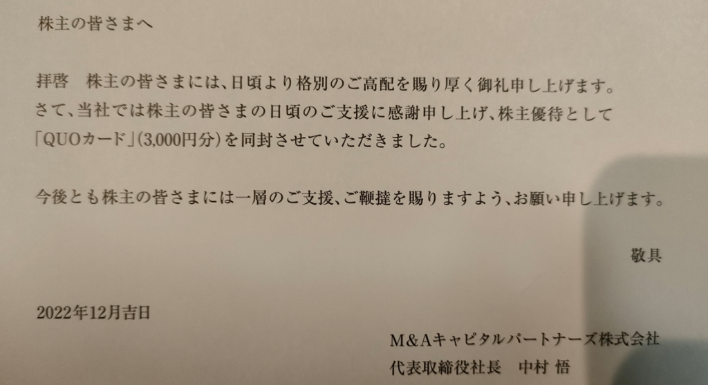 2022年12月某日、『M&Aキャピタルパートナーズ(証券コード:6080)』 から株主優待が届きました。
