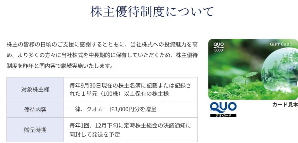 『M&Aキャピタルパートナーズ』の株主優待は、9月に100株保有していれば、『3000円クオカード』が貰えます。優待品を得るための長期株保有条件もないのでおすすめです。