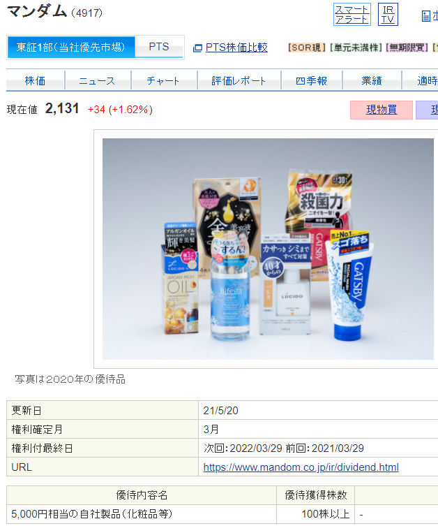 マンダムの株主優待権利がもらえるのは毎年3月。200円で優待ゲット!!