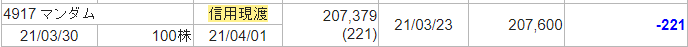 マンダムの株主優待は3月に100株保有していれば、5000円相当の自社製品をゲットできます。ちなみに、クロス取引を利用する場合の手数料は200円程度。それで5000円分の優待品をゲットできるのでおすすめですよ♪↓は私がクロス取引したときの手数料です。221円で5000円分の優待品をゲットしました^^約500円で10000円分ですね☆彡超お得です!!