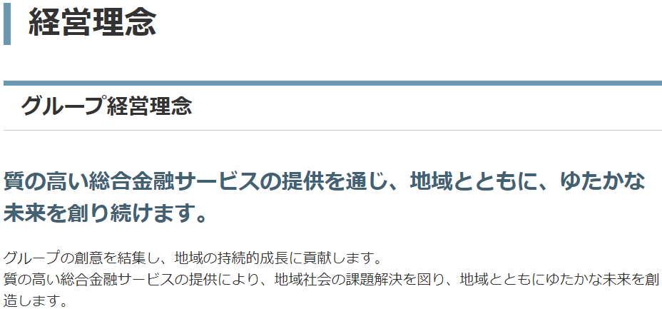 ㈱めぶきファイナンシャルの経営理念をご紹介します。企業理念のキーワードとして、『地域の持続的成長』があります。このことから、企業として利益を上げ、国に税を納め、従業員の雇用に貢献し、お客様に質の良いサービスを提供し、地域とともに企業を永続的に存続させていく意思がひしひしと感じられました☆彡