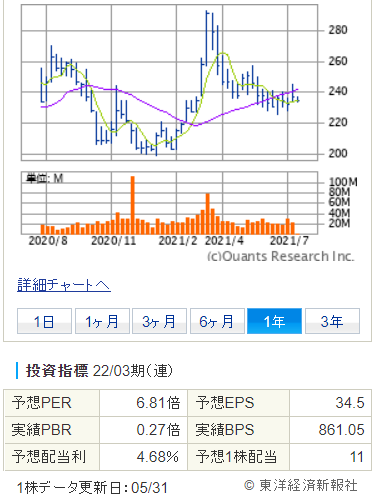 また、週足ベースの1年間のチャートは↓です。変動が大きいですがPBRが0.3倍と魅力的です!