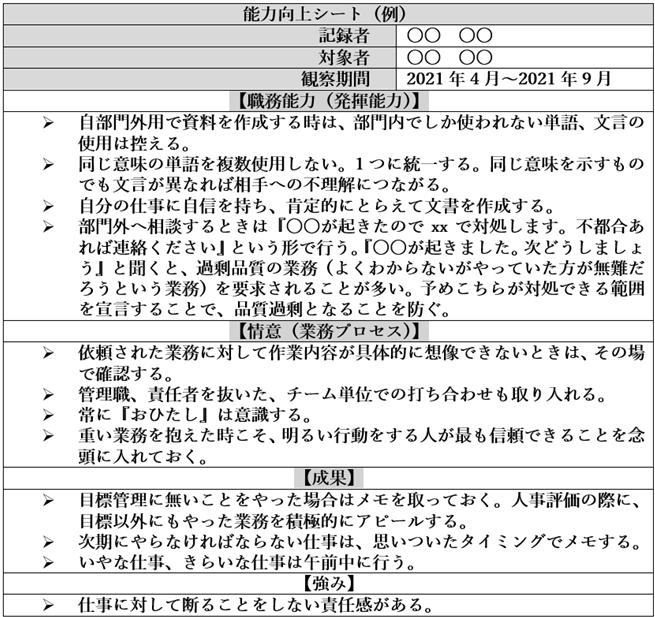 1ヶ月間、部下の成長で気になった点の記録をまとめたものが「能力向上シート」です。下表を見てみてください。口頭指導した内容を書き留め、それを1カ月間続けるとすぐに出来上がります。