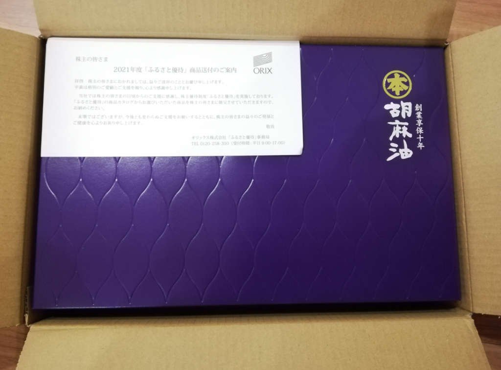 2021年8月某日、『㈱オリックス(証券コード:8591)』 から株主優待が届きました☆彡なんと、太白胡麻油!!