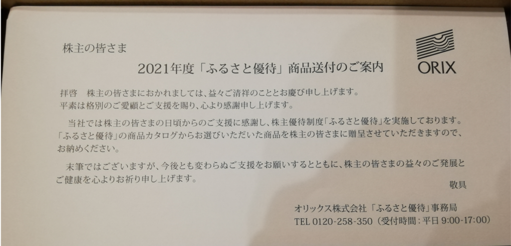 あいさつ文が入っていない企業の株主優待もありますので、 オリックスはかなり信用が置ける会社と感じました^^