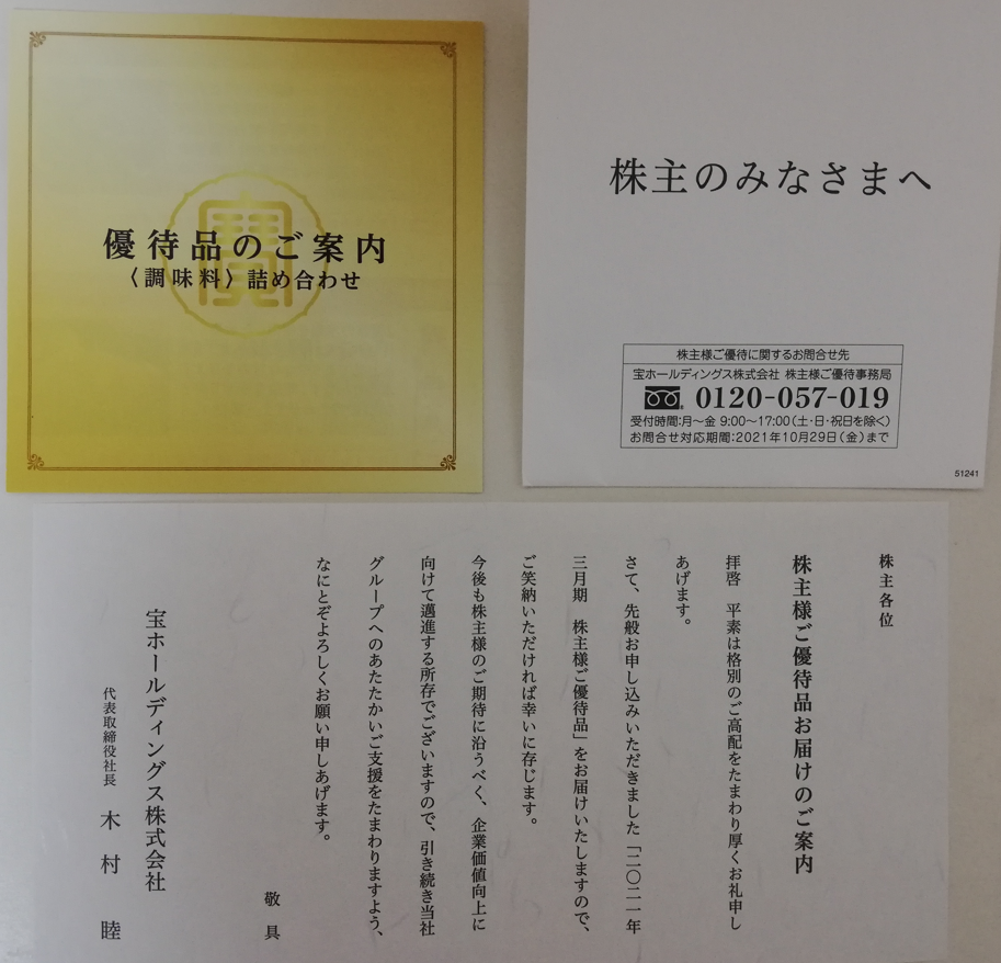 早速開封してみました。すると中から、『株主のみなさまへ』という、丁寧なあいさつ文が入っていました。これだけでも、宝HLDは株主を大事にしている姿勢が垣間見えてきます。