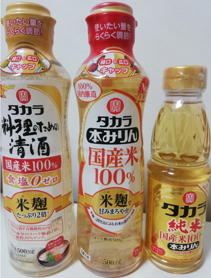 『↓』はパッケージの中身の写真です。3種類の『調味料』がお目見え。『純米 タカラ本みりん』、、、いつも普通の本みりんしか使ったことがないので、どんな味の料理に仕上がるか、楽しみです☆彡
